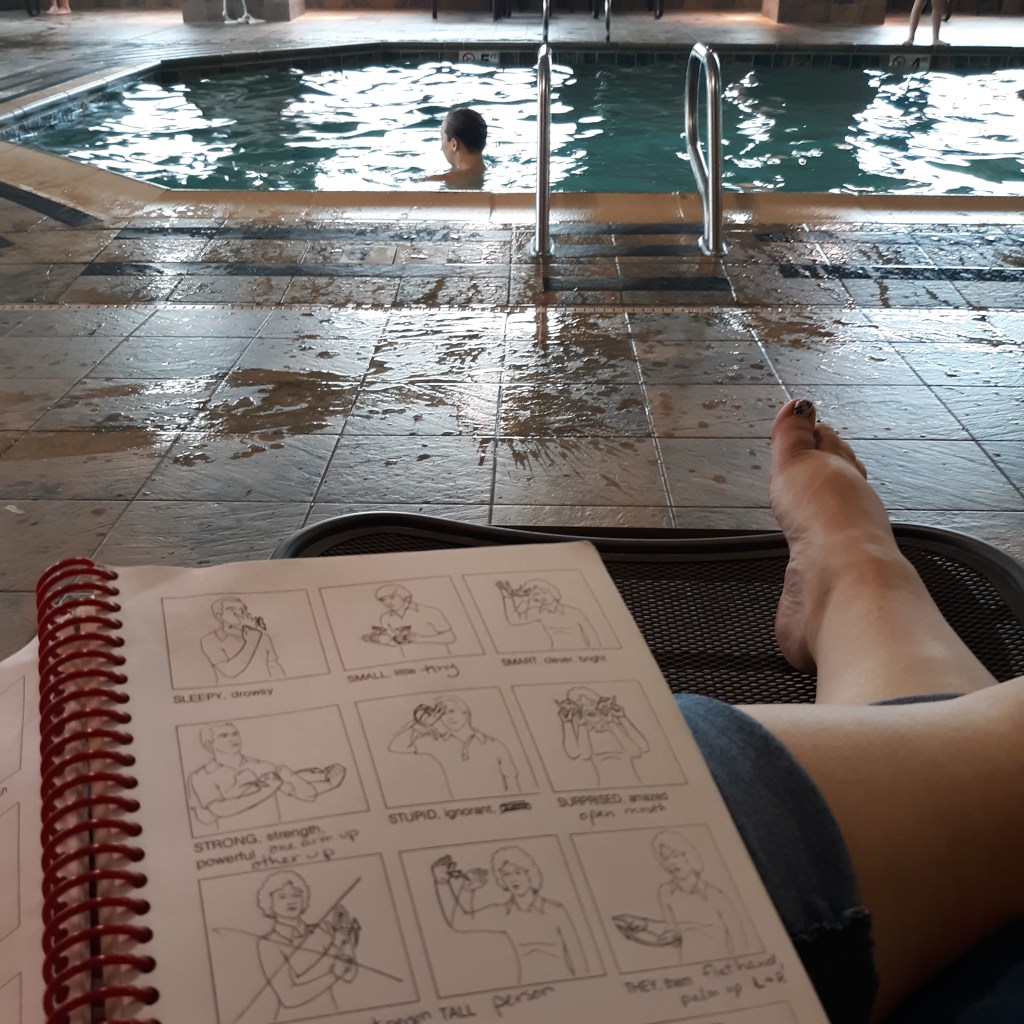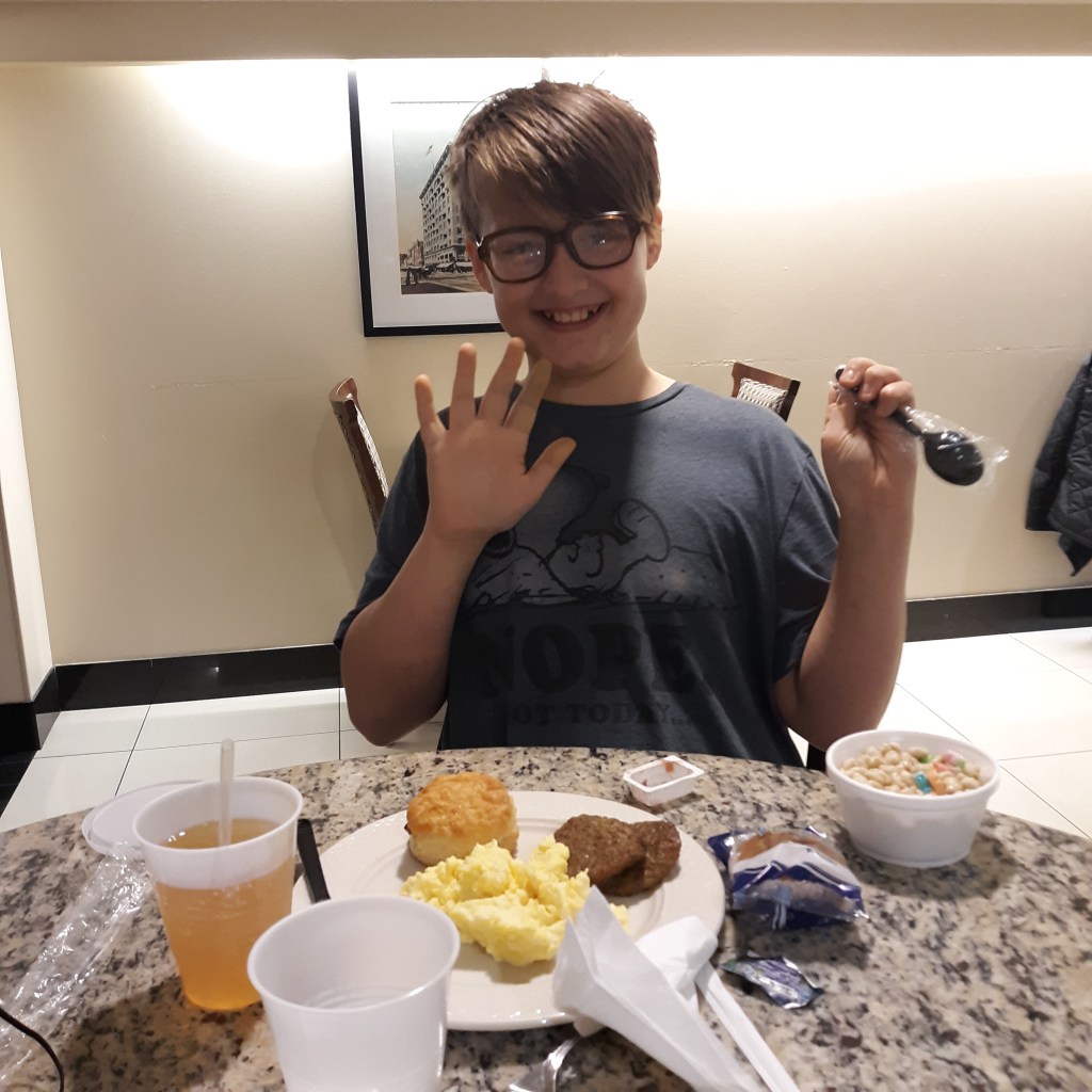 After a fun game and a long day, we headed back to the hotel and settled in for the night. The next morning, the hubby and I were woke up just before 8 AM by some kids that were ready for some breakfast, followed shortly by a lot of fun swimming! So, we headed down to eat and back up (7th floor) to change to swim then back down (around 30 minutes later, we aren’t crazy, lol) to let the boys swim for a couple of hours while I studied for the ASL class that I am taking. The boys had a lot of fun swimming, but after two hours, their dad and I had to pull them away to head back to the room to change.