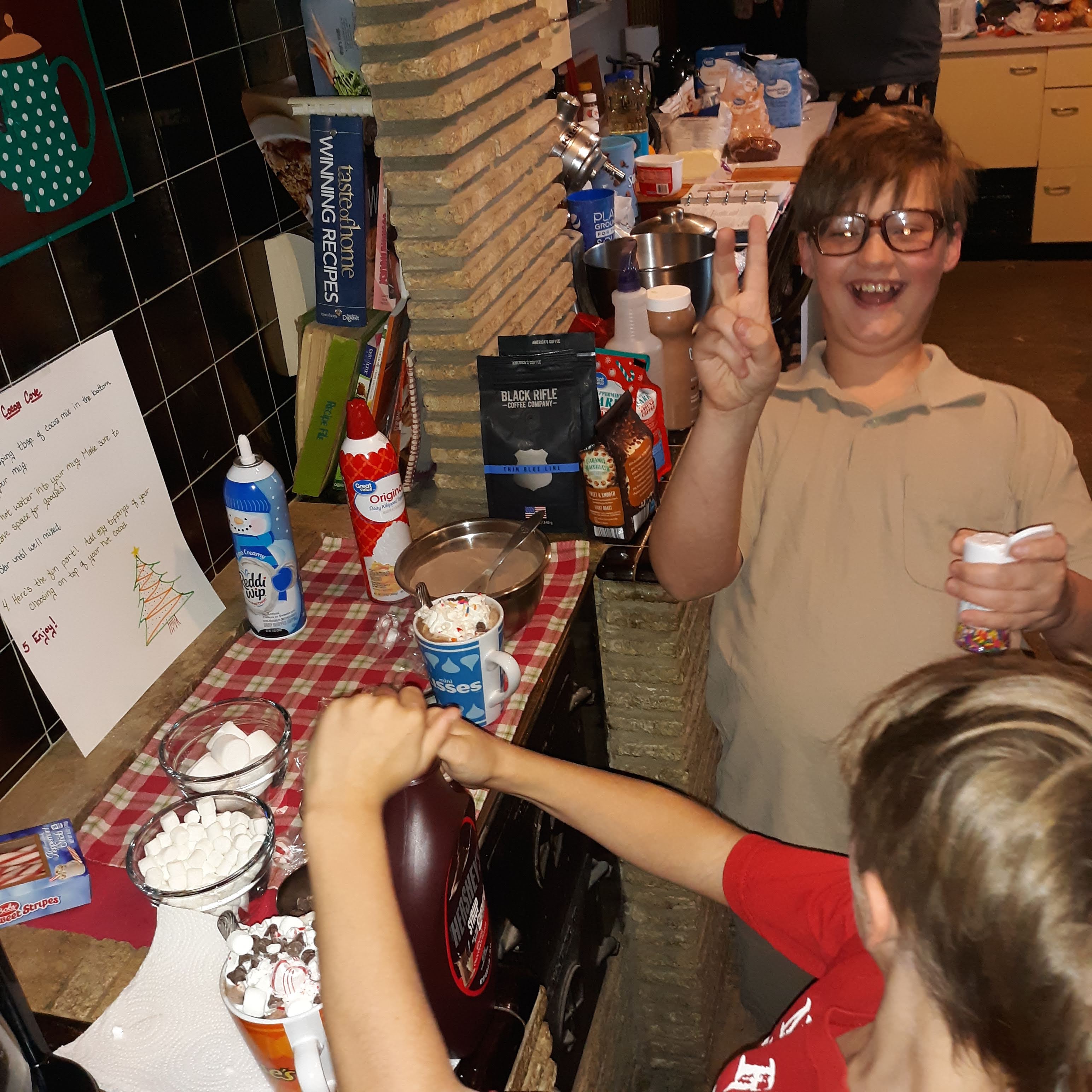 Hey, we’re the Donovans! Well, technically, that picture is of the youngest two Donovans. That is Connor (the taller one) and Patrick (the smaller one), they are our two crazy boys! The picture is from Christmas when I set them up a Hot Cocoa Cove and they loved it! Hence, the goofy smiles in the pic! 🙂